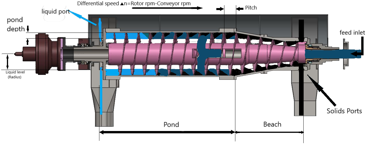 The 2-phase decanter is set up like the diagram below. By setting the retaining plates at a correct relative to the solids outlet, equilibrium is found where the solids and enough water are expelled from the solids and the oil flows out the oil outlet.